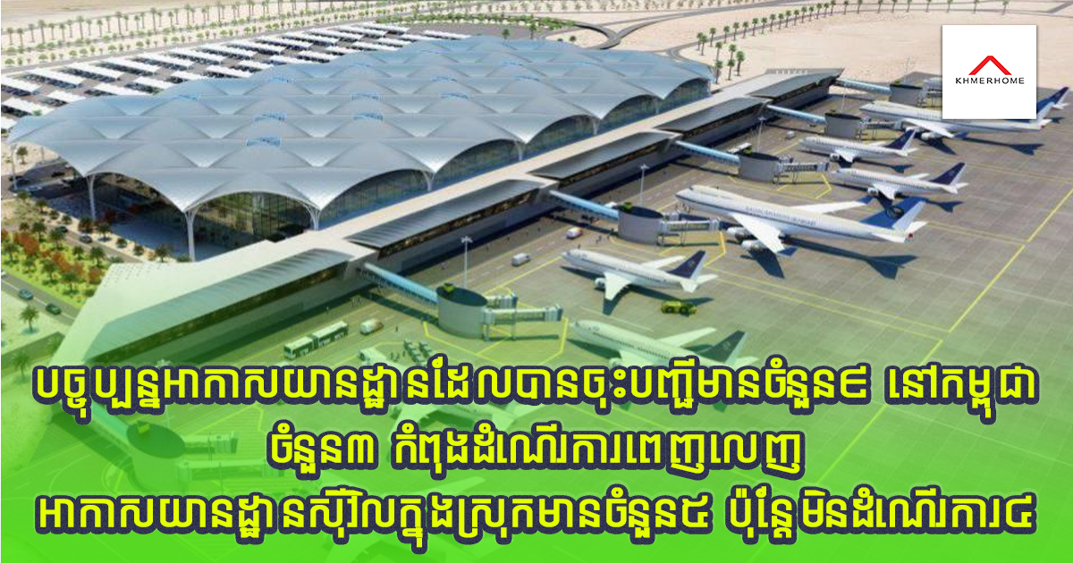 បច្ចុប្បន្ន អាកាសយានដ្ឋានដែលបានចុះបញ្ជីមានចំនួន៩ នៅកម្ពុជា ក្នុងនោះ មាន៣កំពុងដំណើរការពេញលេញ មានដូចជា អាកាសយានដ្ឋានអន្តរជាតិភ្នំពេញ អាកាសយានដ្ឋានអន្តរជាតិសៀមរាបអង្គរ និងអាកាសយានដ្ឋានអន្តរជាតិខេត្តព្រះសីហនុ និងកំពុងដំណើរការដោយក្រុមហ៊ុន សម្បទានអាកាសយានដ្ឋាន (SCA) ជាមួយនឹងសិទ្ធិផ្តាច់មុខរហូតដល់ឆ្នាំ២០៤០។ បើតាមរបាយការណ៍ខាងលើ។