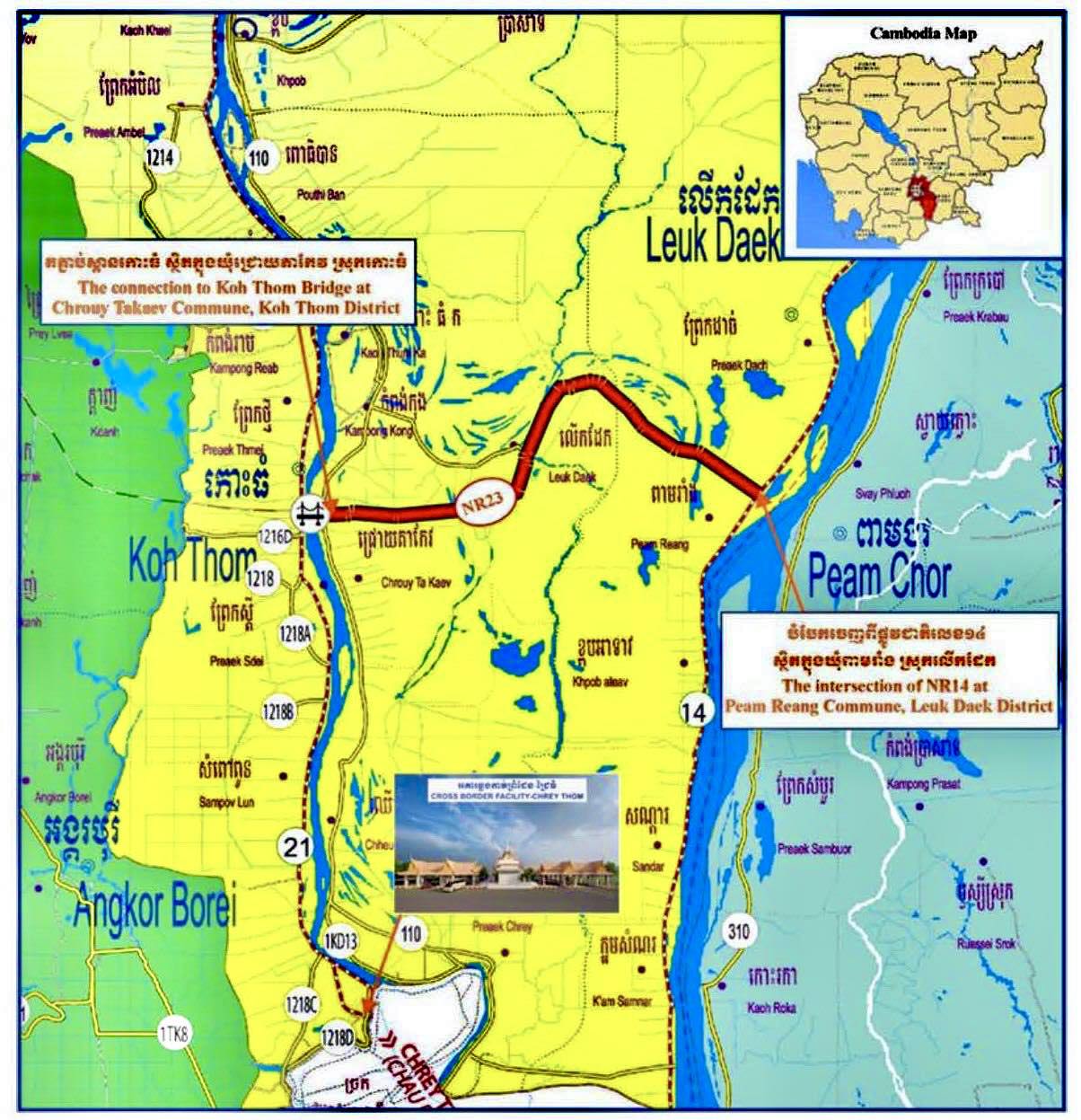កណ្ដាល៖ កំណាត់ផ្លូវជាតិលេខ២៣ ប្រវែង ១៩,៨គីឡូម៉ែត្រ ចាប់ពីគល់ស្ពានកោះធំត្រើយខាងកើត ស្ថិតក្នុងឃុំជ្រោយតាកែវ ស្រុកកោះធំ ដល់ផ្លូវជាតិលេខ១៤ ឃុំពាមរាំង ស្រុកលើកដែក ខេត្តកណ្តាល សម្រេចការស្ថាបនាបានរួចរាល់១០០% ហើយកាលពីដើមខែតុលា ឆ្នាំ២០២៥។ បើតាក្រសួងសាធារណការ និងដឹកជញ្ជូន។