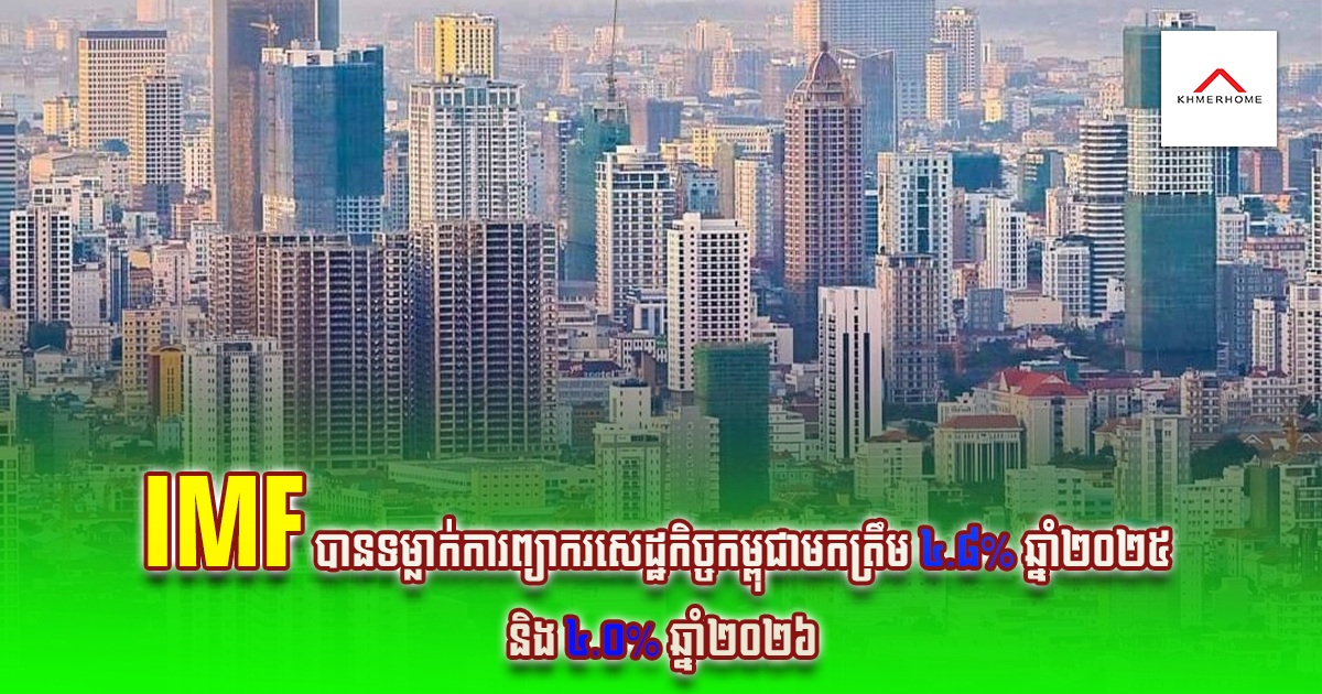 ភ្នំពេញ៖ កំណើនសេដ្ឋកិច្ចកម្ពុជានឹងថយចុះមកត្រឹម ៤.៨ភាគរយនៅឆ្នាំ២០២៥ និងបន្តថយចុះដល់ប្រហែល ៤.០ភាគរយនៅឆ្នាំ២០២៦។ បើតាមការព្យាករមូលនិធិរូបិយវត្ថុអន្តរជាតិ (IMF) បានសេចក្តីប្រកាសព័ត៌មាននៅថ្ងៃទី២៥ ខែវិច្ឆិកា ឆ្នាំ២០២៥។