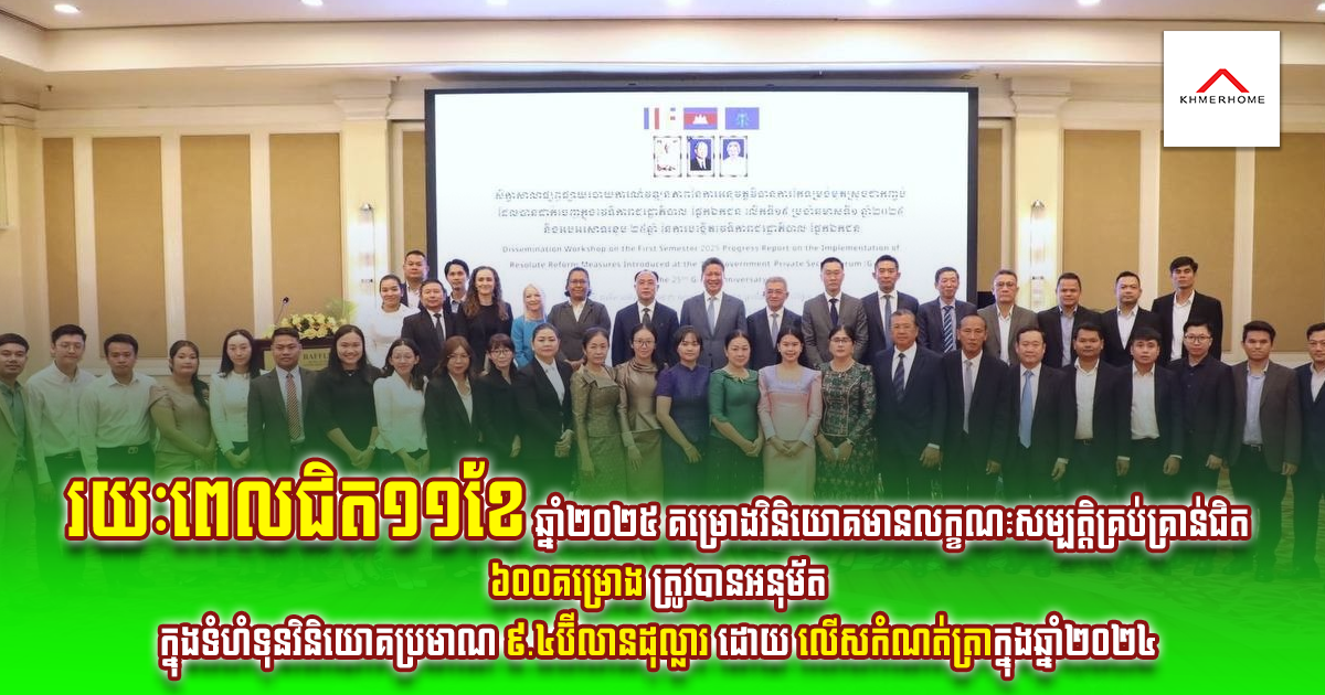 ភ្នំពេញ៖ រយៈពេលជិត១១ខែនៃឆ្នាំ២០២៥ បានអនុម័តគម្រោងវិនិយោគមានលក្ខណៈសម្បត្តិគ្រប់គ្រាន់ ជិត ៦០០គម្រោង ក្នុងទំហំទុនវិនិយោគសរុបប្រមាណ ៩.៤ប៊ីលានដុល្លារ អាម៉េរិក។ តួលេខនេះ គឺលើសកំណត់ត្រាដែលសម្រេចបាននៅក្នុងឆ្នាំ២០២៤។ បើតាម សេចក្តីប្រកាសព័ត៌មានរួម ស្តីពីវេទិការាជរដ្ឋាភិបាល-ផ្នែកឯកជន អបអរសាទរខួប ២៥ឆ្នាំ នៃកិច្ចសន្ទនា ភាពជាដៃគូ និងកំណែទម្រង់។