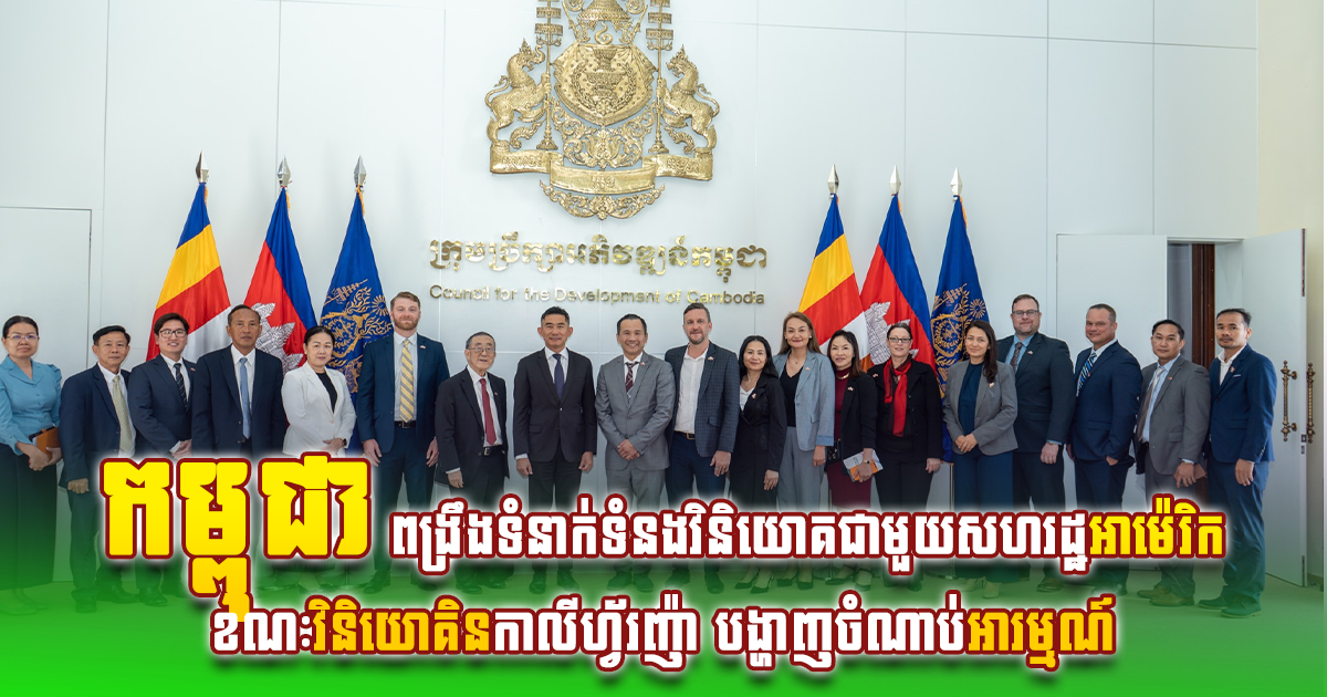 ភ្នំពេញ៖ កម្ពុជា កំពុងបន្តជំរុញការពង្រឹងទំនាក់ទំនងពាណិជ្ជកម្ម និងវិនិយោគជាមួយសហរដ្ឋអាម៉េរិក ខណៈមន្ត្រីជាន់ខ្ពស់នៃក្រុមប្រឹក្សាអភិវឌ្ឍន៍កម្ពុជា (CDC) បានជួបពិភាក្សាការងារជាមួយគណៈប្រតិភូសភាពាណិជ្ជកម្មកម្ពុជា ប្រចាំរដ្ឋកាលីហ្វ័រញ៉ា ដែលបង្ហាញពីការចាប់អារម្មណ៍កើនឡើងរបស់វិនិយោគិនអាម៉េរិក ចំពោះវិស័យសំខាន់ៗនៅកម្ពុជា នៅថ្ងៃចន្ទ ទី២៦ ខែមករា។