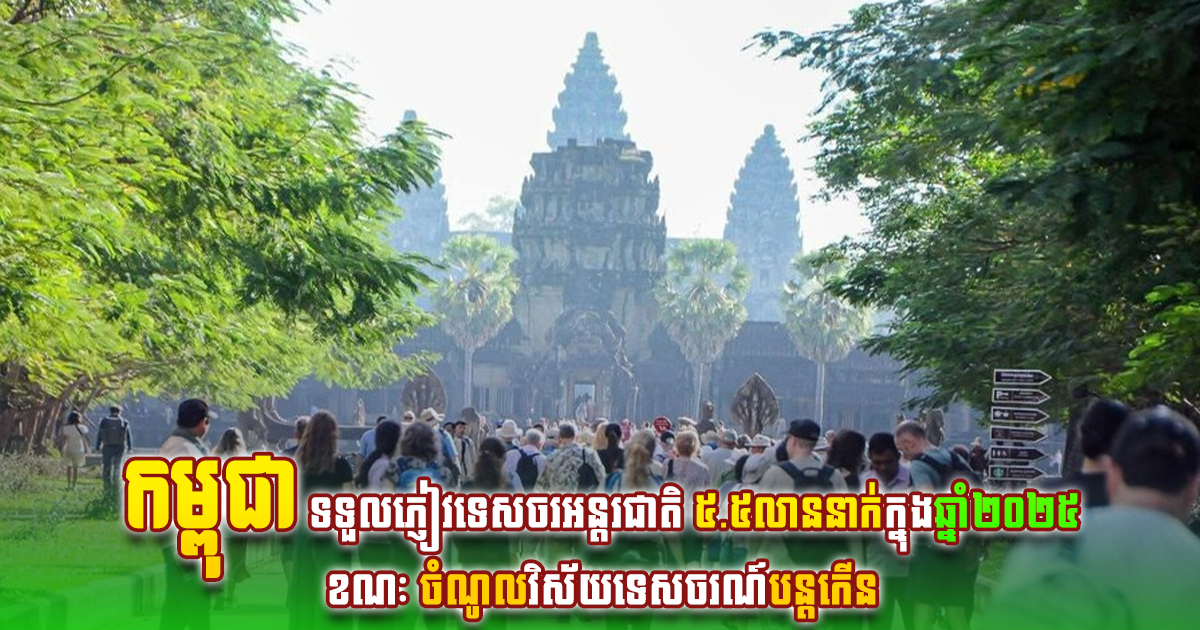 ភ្នំពេញ៖ កម្ពុជាបានទទួលភ្ញៀវទេសចរអន្តរជាតិជាង ៥.៥លាននាក់ ក្នុងឆ្នាំ២០២៥ បើទោះបីជាចំនួននេះថយចុះប្រហែល ១៦.៩% បើប្រៀបធៀបនឹងឆ្នាំ២០២៤ ដែលមានភ្ញៀវប្រមាណ ៦.៧លាននាក់ ក៏ដោយ។ នេះបើយោងតាមរបាយការណ៍ចុងក្រោយរបស់ ក្រសួងទេសចរណ៍។