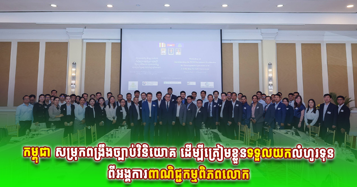 ភ្នំពេញ៖ កម្ពុជាបានចាប់ផ្តើមដំណើរការវាយតម្លៃតម្រូវការផ្ទៃក្នុងរបស់ខ្លួន ដើម្បីត្រៀមអនុវត្តកិច្ចព្រមព្រៀងថ្មីមួយរបស់អង្គការពាណិជ្ជកម្មពិភពលោក (WTO) ស្តីពីកិច្ចសម្រួលវិនិយោគ ដែលគេរំពឹងថានឹងជួយជំរុញលំហូរទុនវិនិយោគបរទេស និងបង្កើតការងារបន្ថែមទៀត។