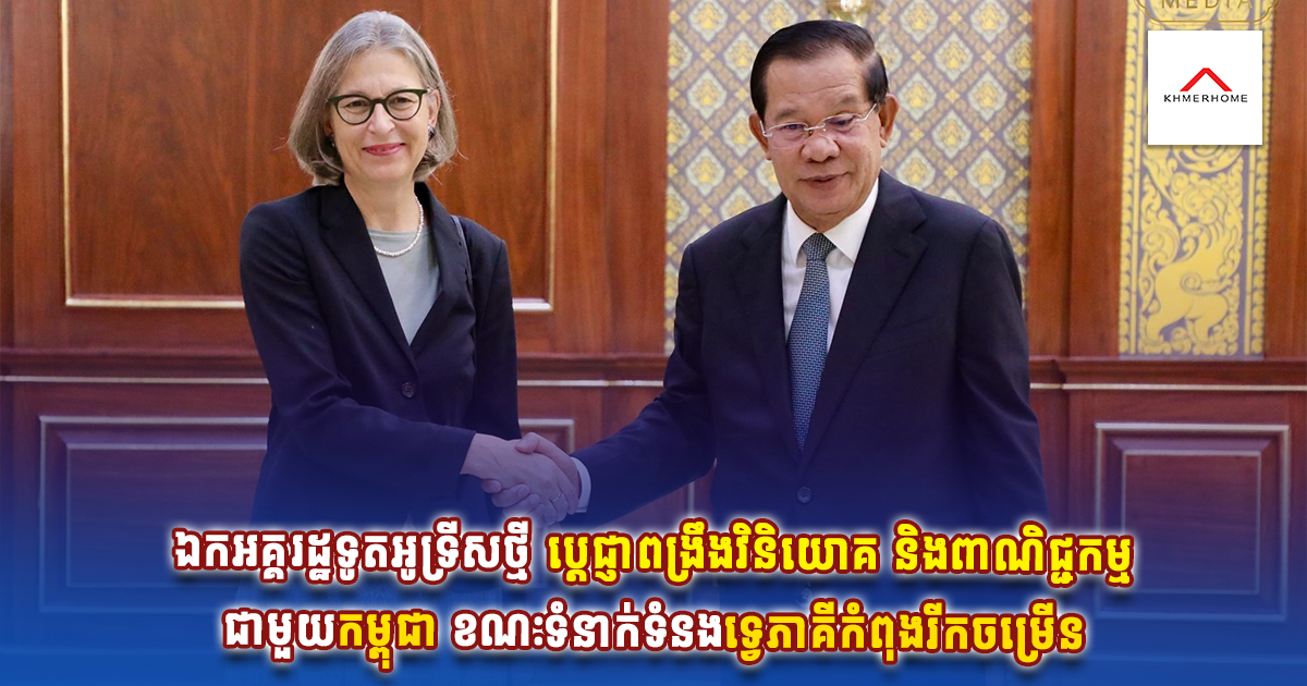 នាឱកាសនោះ សម្តេចតេជោ ក៏បានជូនពរលោកស្រីឯកអគ្គរដ្ឋទូត ឱ្យទទួលបានជោគជ័យក្នុងបេសកកម្មការទូតនៅកម្ពុជា ដោយជឿជាក់ថា កិច្ចសហប្រតិបត្តិការរវាងប្រទេសទាំងពីរនឹងកាន់តែរីកចម្រើនថែមទៀត ស្របពេលដែលក្រុមហ៊ុនអូទ្រីសគ្រោងនឹងមកស្វែងយល់ពីឱកាសវិនិយោគនៅកម្ពុជានាពេលខាងមុខនេះ៕