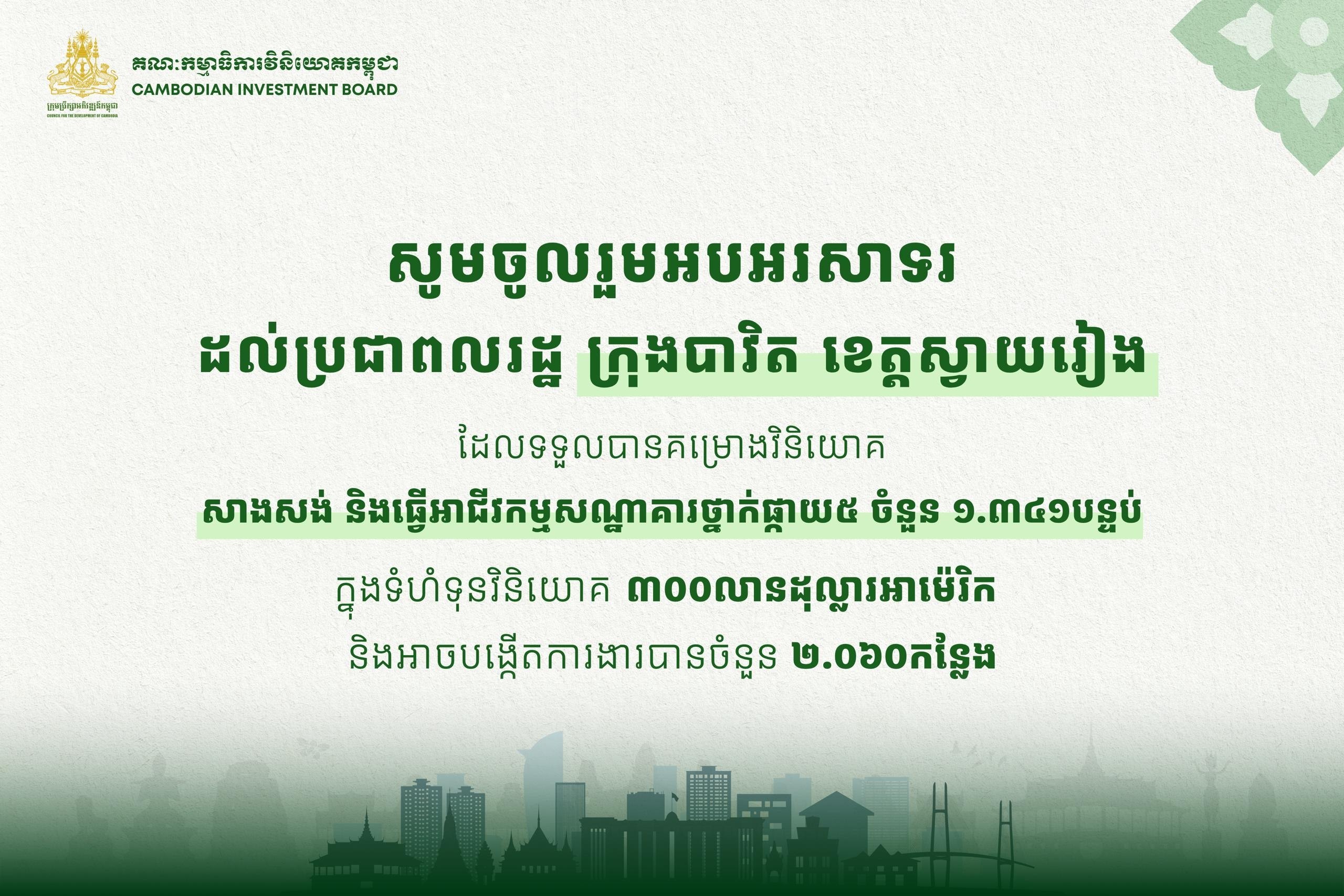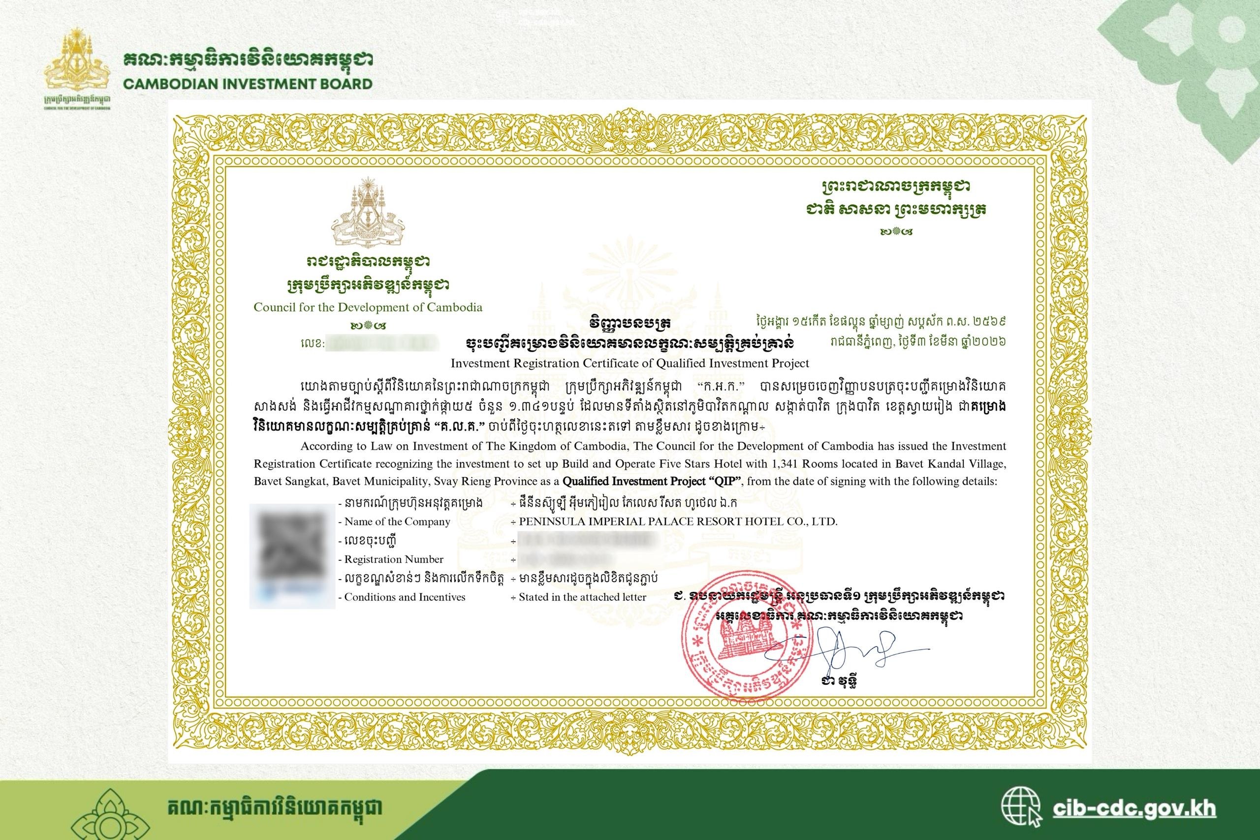 ភ្នំពេញ៖ ក្រុមប្រឹក្សាអភិវឌ្ឍន៍កម្ពុជា (CDC) បានសម្រេចចេញវិញ្ញាបនបត្រចុះបញ្ជីគម្រោងវិនិយោគថ្មីមួយ សម្រាប់ការសាងសង់ និងដំណើរការអាជីវកម្មសណ្ឋាគារថ្នាក់ផ្កាយ ៥ ចំនួន ១៣៤១ បន្ទប់ និងអាចបង្កើតការងារជាង ២០០០ កន្លែង ដែលមានទីតាំងស្ថិតនៅភូមិបាវិតកណ្តាល សង្កាត់បាវិត ក្រុងបាវិត ខេត្តស្វាយរៀង។