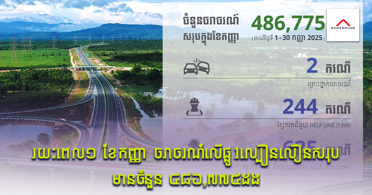 រយៈពេល១ខែកញ្ញា ចរាចរណ៍លើផ្លូវល្បឿនលឿនសរុបមានចំនួន ៤៨៦,៧៧៥ដង