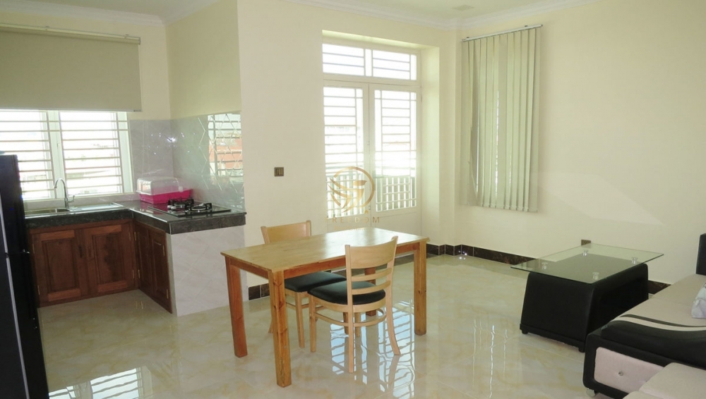This apartment is located in Teuk Laóuk3 of Toul Kork District area, It is very inconvenience area where surrounding by Restaurant, Super Market, Pizza Store, KFC, Cafe, University, Mart, Bus Stop...etc. Especially, This apartment is look very clean, brightness and largest space. Landlord are friendly and professional to speak English.