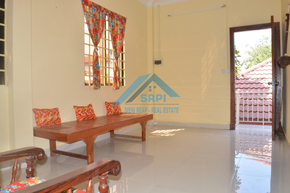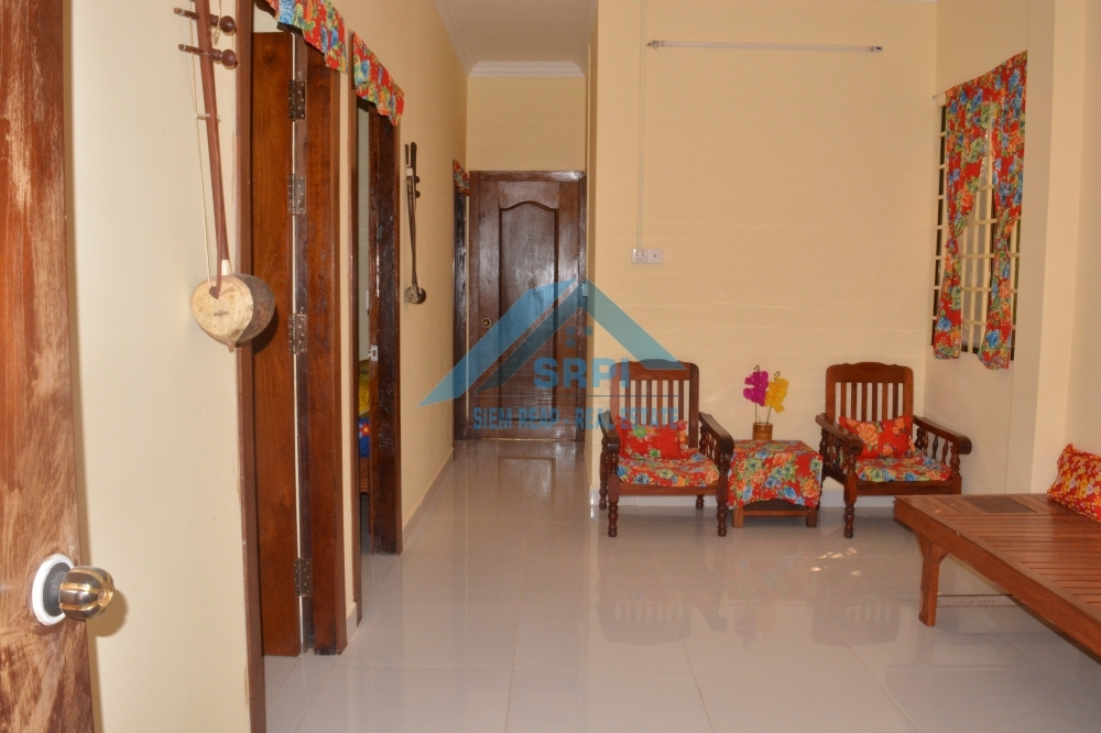 Introducing to a quite affordable 2 – bedroom house for rent location in Sangkat Koak Chork, Siem Reap Town, Cambodia. The property provides with partially furnished, shared garden and a secured parking area. The bedroom is en-suite and equipped with A/C, fitted wardrobe and an en-suite bathroom with hot water. In addition, the living room provides a wooden sofa set and an extra fan. The kitchen comes completely with refrigerator [Nego], gas stove set and gas tank and dining table set. The surrounding environment is secured and the road condition is OKAY. This is the must see property. Call or send us a message to schedule the time to visit this nice HOUSE.