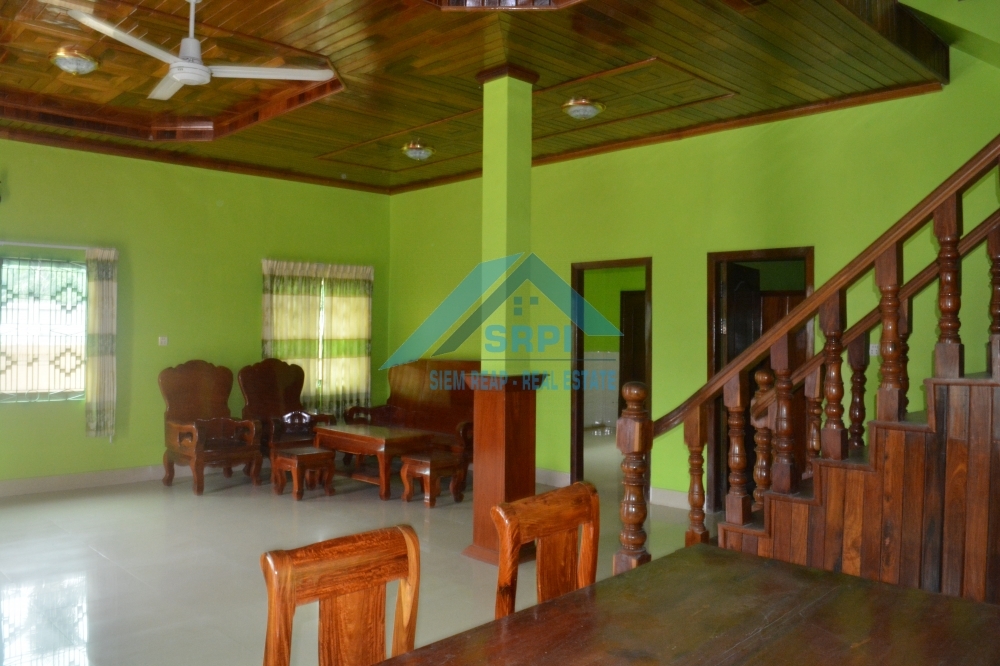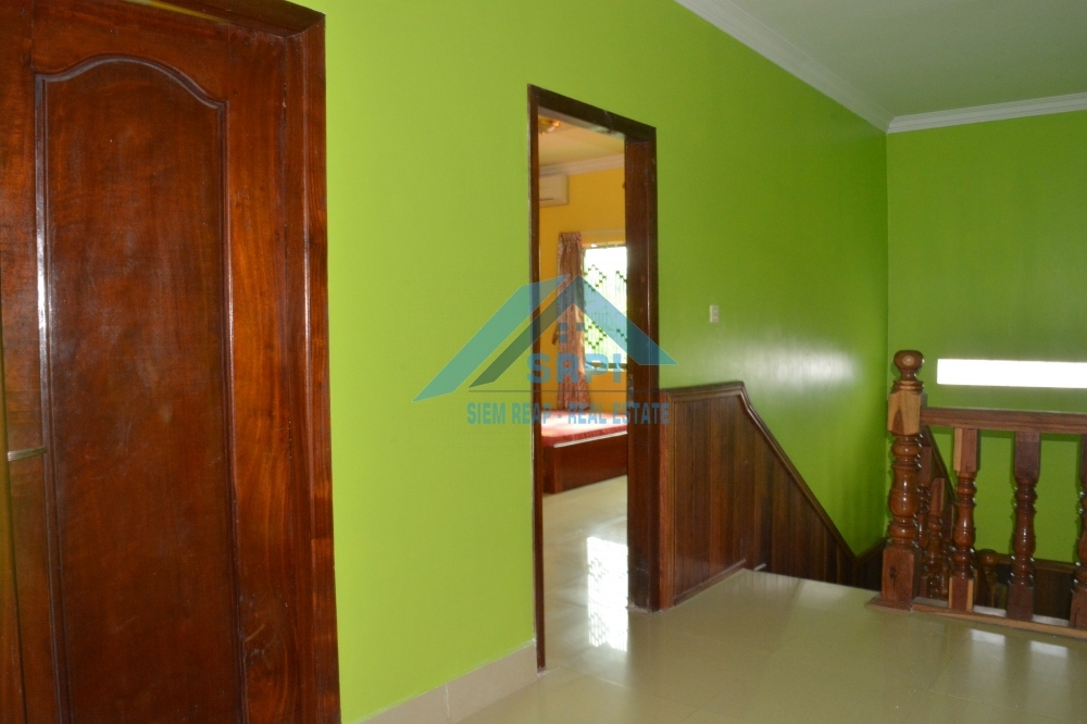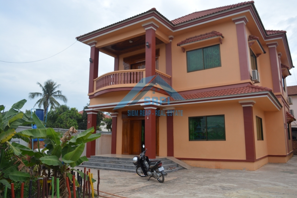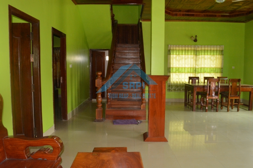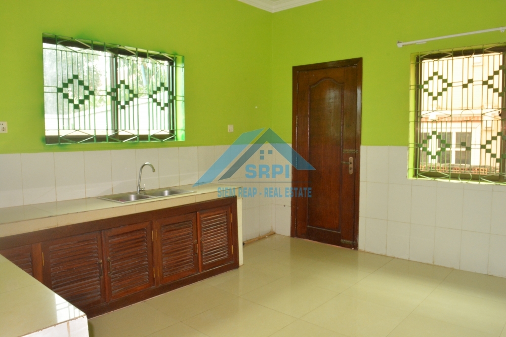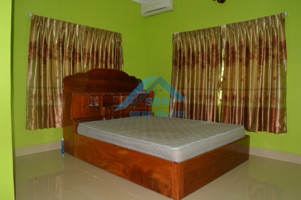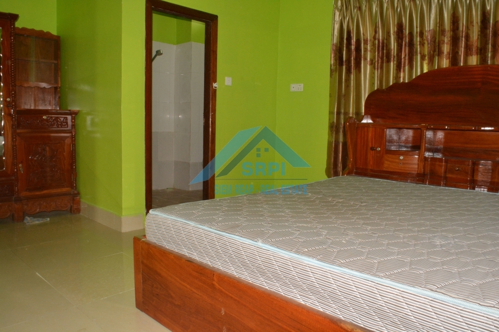 Descriptive of 4 – bedroom villa for rental is well located in Sangkat Svay Dangkum, Siem Reap Town, Cambodia. This property provides with semi-furnished, garden and a large secured space. Every bedroom is en-suite and equipped with air-conditioned, fitted wardrobe, bedside table and the bathroom is comes with hot water. Moreover, The living room provides comfortable wooden sofa set with an extra ceiling fan. The kitchen comes completely with an ample space for cooking, a refrigerator, gas stove set, gas tank and dining table set. The surrounding environment is secured and the road condition is GOOD. This is the must see property. Call or send us a message to schedule the time to visit this HOUSE.