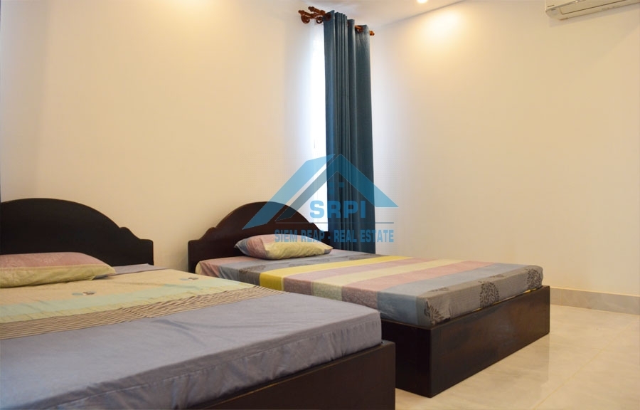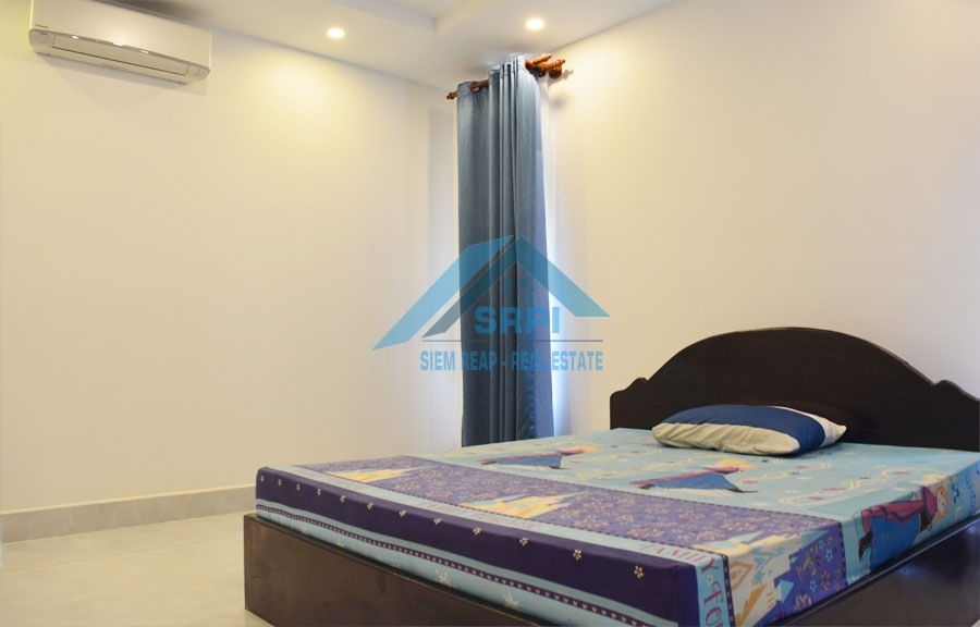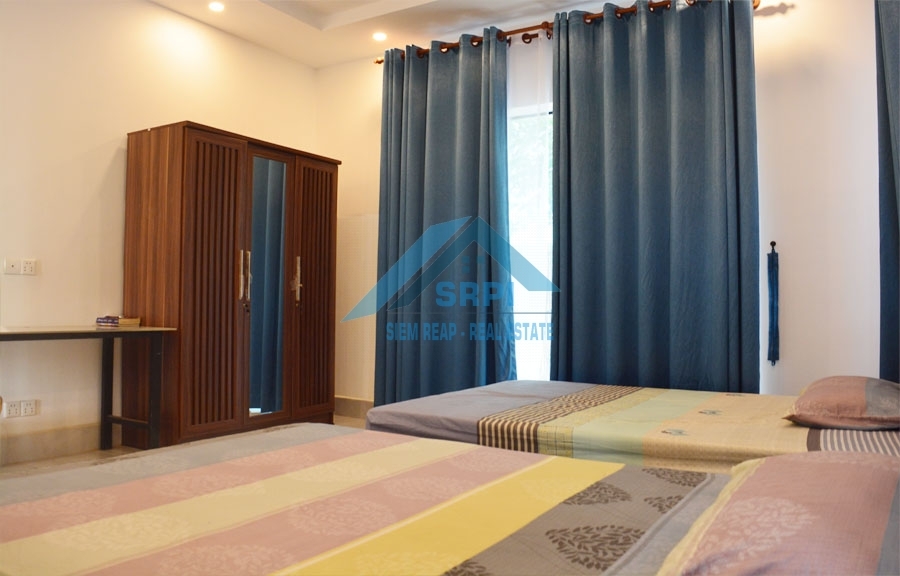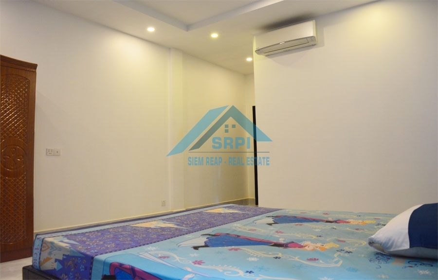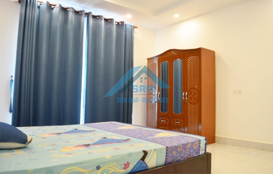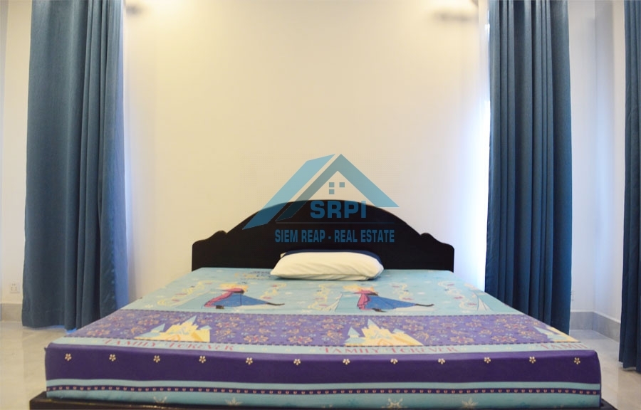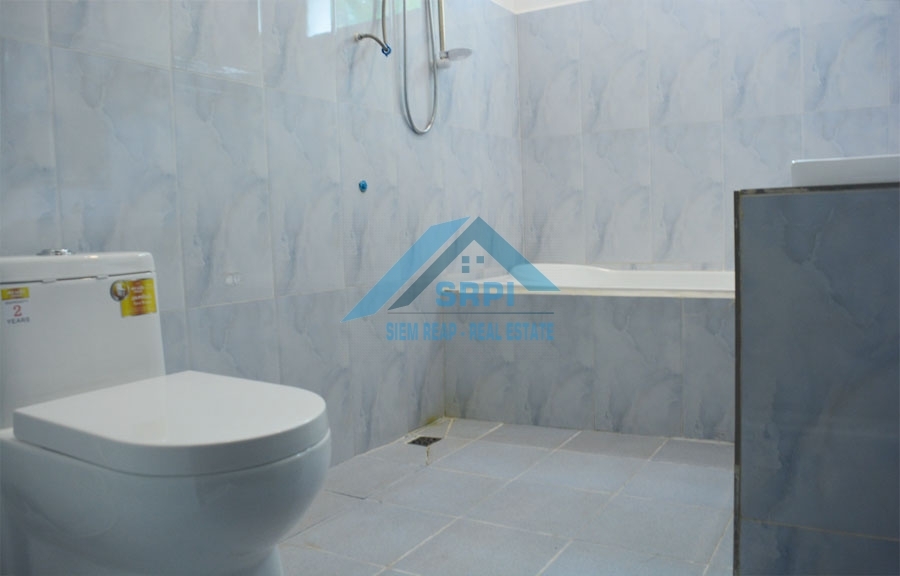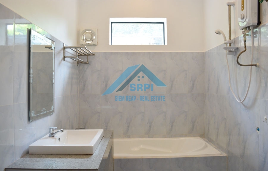 Introduce to an amazing and greenish 2 – bedroom house for rent location in Sangkat Sala Kamreuk, Siem Reap Town, Cambodia. The property provides high quality fully furnished, large greenish garden and a specious secured parking area. Every bedroom is en-suite and equipped with air-conditioned, fitted wardrobe, bedside table and an en-suite bathroom with hot water and bathtub. In addition, the living room provides comfortable couch set and air-conditioning with flat screen TV. The kitchen is big and comes completely with an ample space for cooking, refrigerator, washing machine, gas stove set and gas tank and wooden dining table set. The surrounding environment is secured and the road condition is OKAY.
