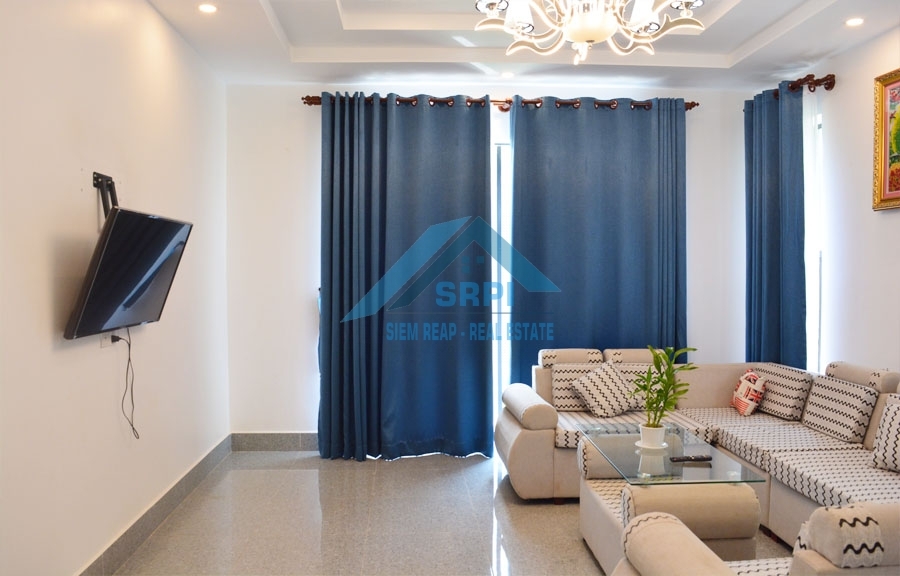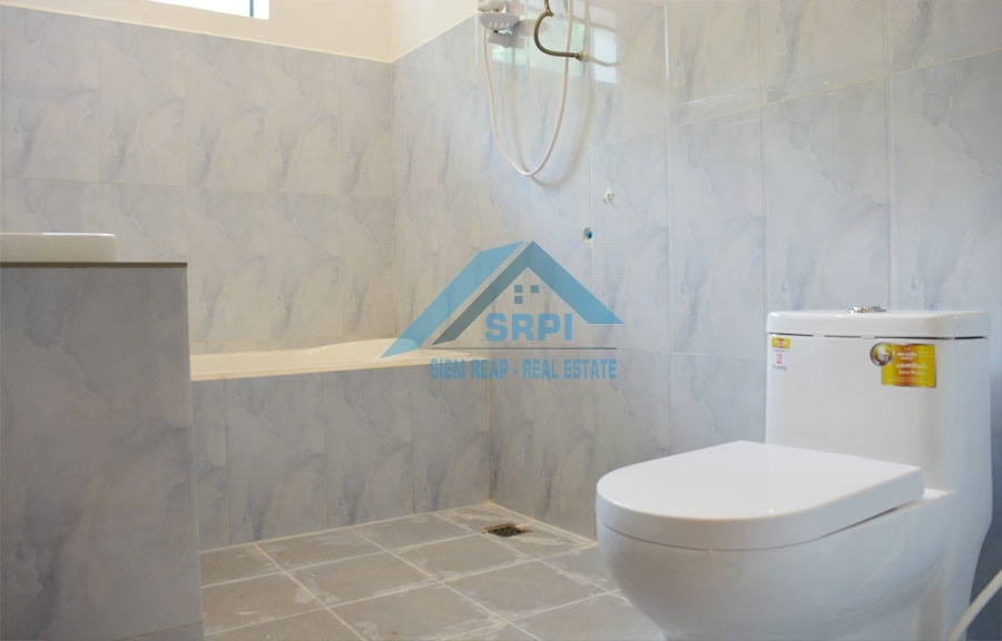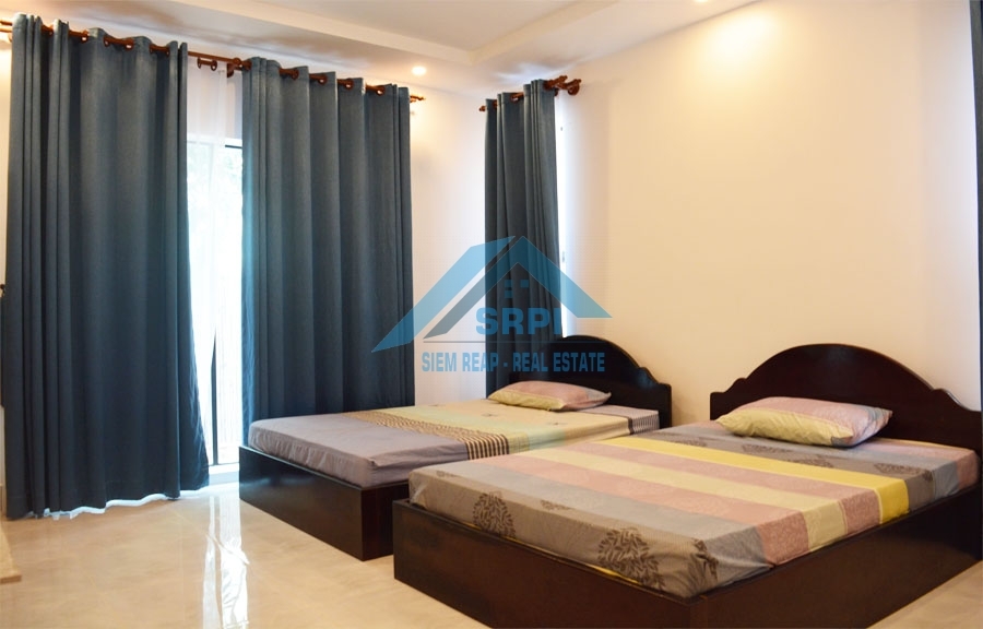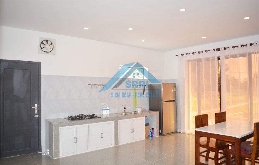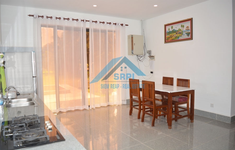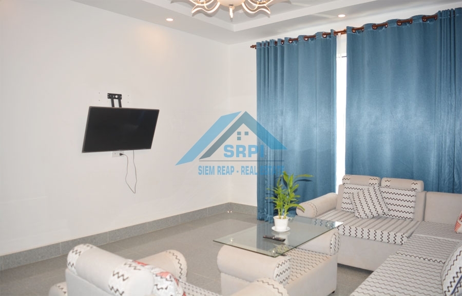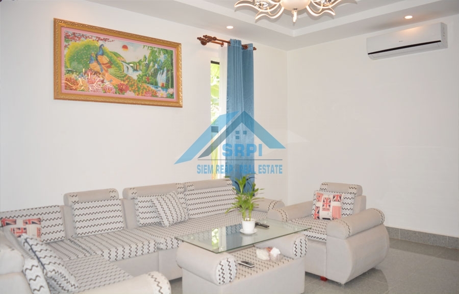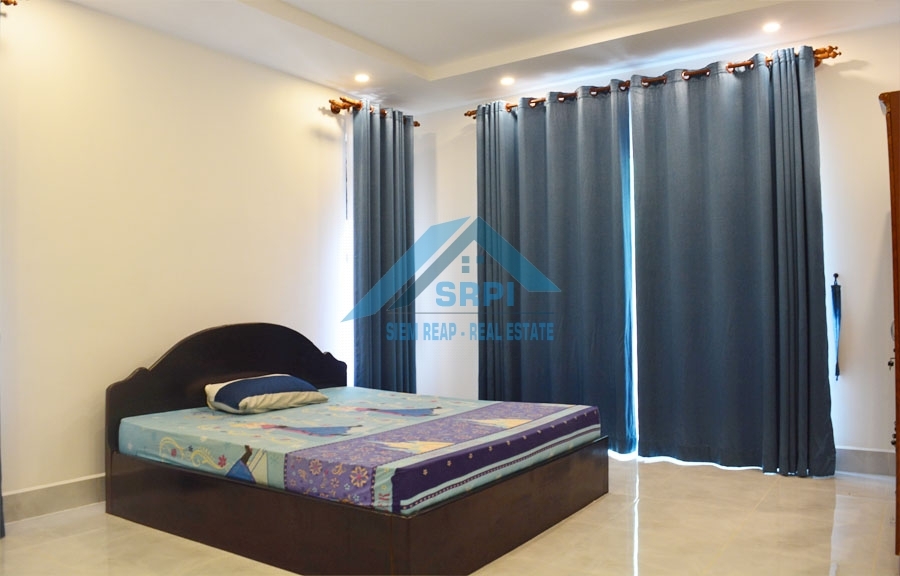 Introduce to an amazing and greenish 2 – bedroom house for rent location in Sangkat Sala Kamreuk, Siem Reap Town, Cambodia. The property provides high quality fully furnished, large greenish garden and a specious secured parking area. Every bedroom is en-suite and equipped with air-conditioned, fitted wardrobe, bedside table and an en-suite bathroom with hot water and bathtub. In addition, the living room provides comfortable couch set and air-conditioning with flat screen TV. The kitchen is big and comes completely with an ample space for cooking, refrigerator, washing machine, gas stove set and gas tank and wooden dining table set. The surrounding environment is secured and the road condition is OKAY.