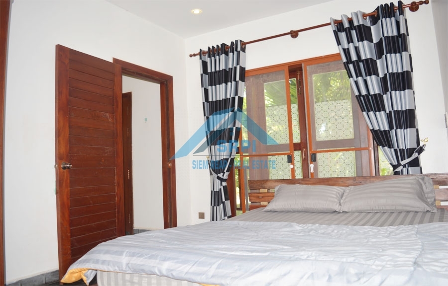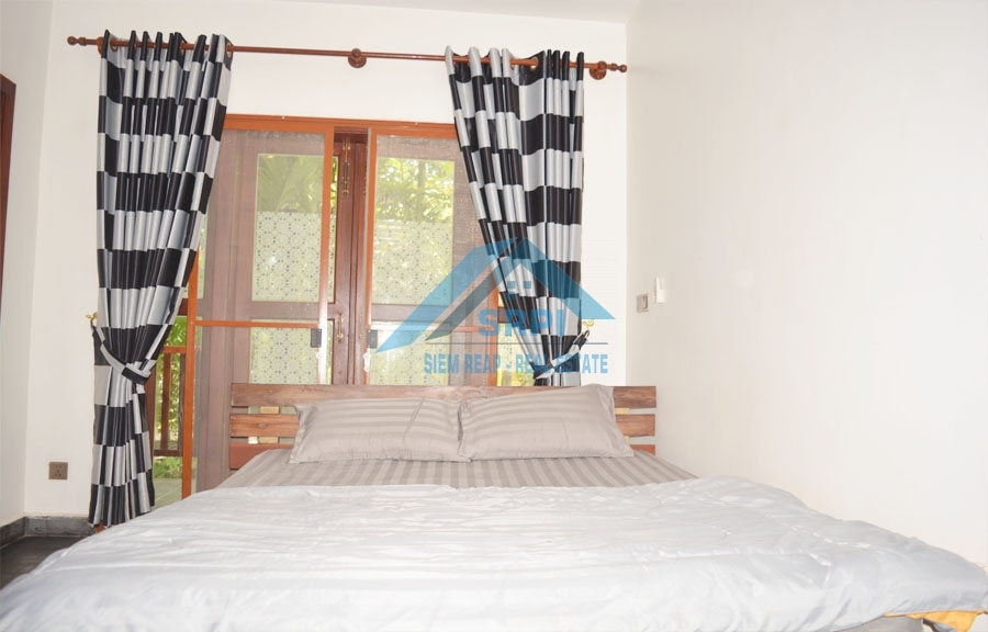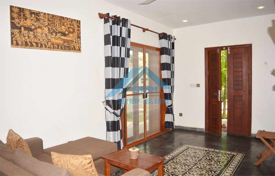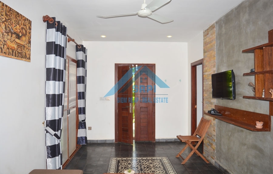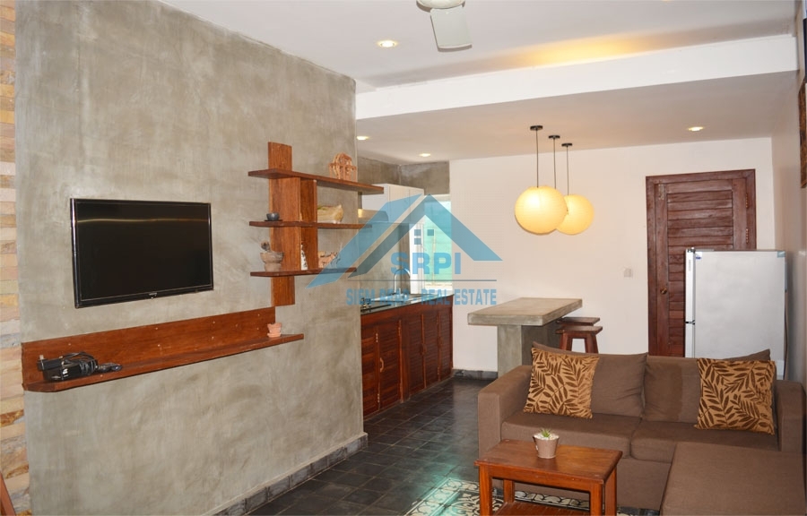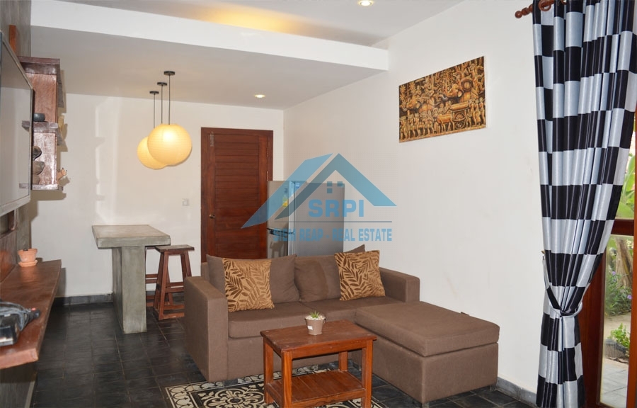 Introduce to an affordable and tropical 1 – bedroom apartment for rent location in Sangkat Svay Dangkum, Siem Reap Town, Cambodia. This property provides high quality fully furnished, greenish garden and secured parking space. The bedroom is suite and equipped with A/C, fitted wardrobe, a bedside table and an en-suite bathroom with hot water. Moreover, the living room provides comfortable wooden sofa set, a flat screen TV and an extra ceiling fan. The kitchen is medium and comes complete with refrigerator, a set of dining table, gas stove set and gas tank. The surrounding environment is secured and the road condition is OKAY. It’s inclusive of internet fee and garbage collection fee.