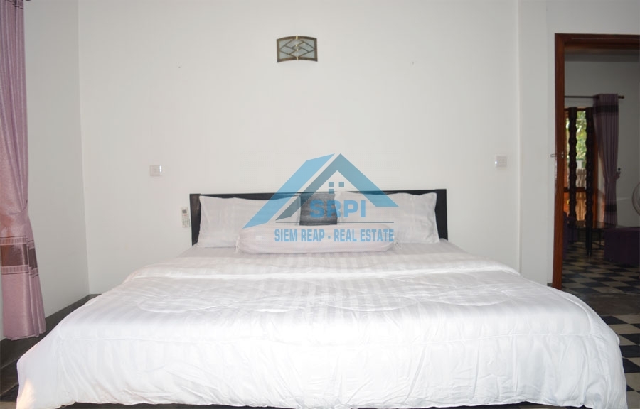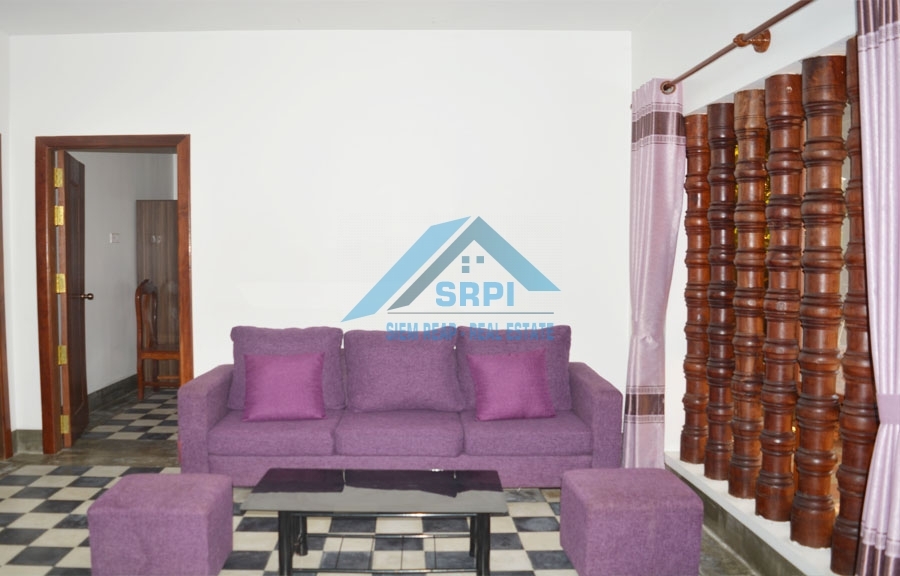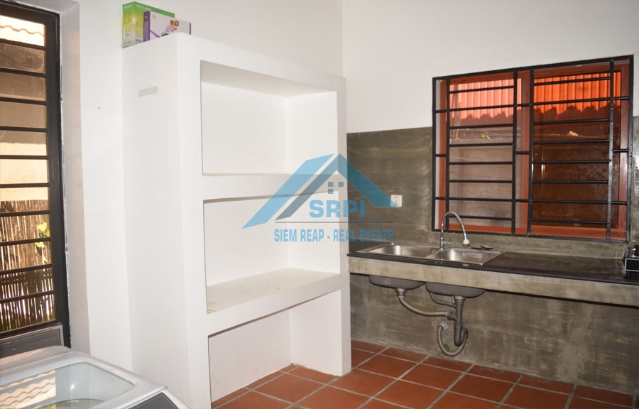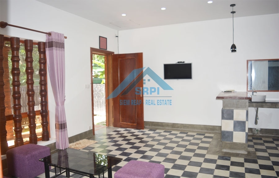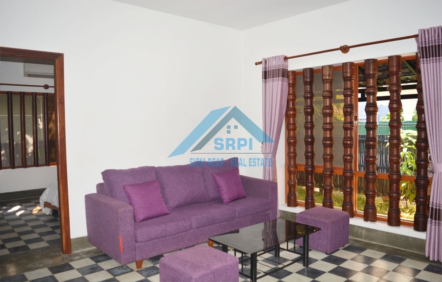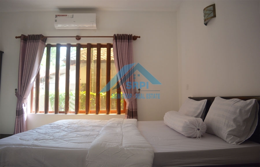 Introduce to an affordable and greenish 2 – bedroom villa for rent location in Sangkat Slor Kram, Siem Reap Town, Cambodia. This property provides with fully furnished, greenish garden and parking space. Each bedroom is en-suite and equipped with air-conditioning, fitted wardrobe, bedside table and an en-suite bathroom with hot water. Furthermore, the living room provides comfortable sofa set with an extra ceiling fan and flat screen TV. The kitchen is medium and comes completely with an ample space for cooking, a refrigerator, gas stove set, gas tank and dining table set. The surrounding environment is secured and the road condition is good.