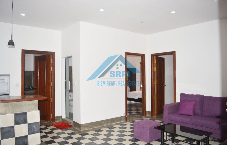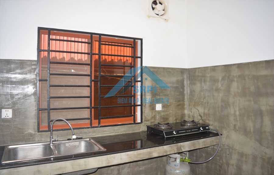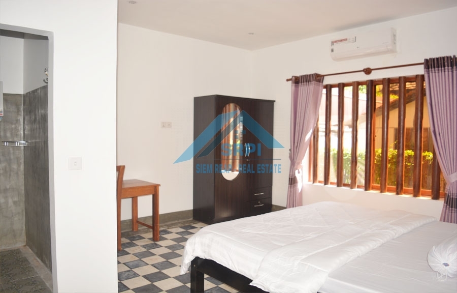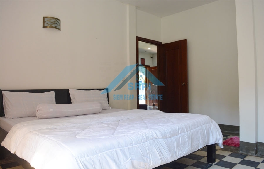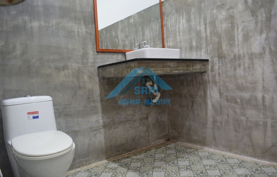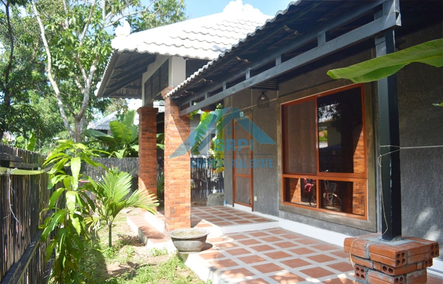 Introduce to an affordable and greenish 2 – bedroom villa for rent location in Sangkat Slor Kram, Siem Reap Town, Cambodia. This property provides with fully furnished, greenish garden and parking space. Each bedroom is en-suite and equipped with air-conditioning, fitted wardrobe, bedside table and an en-suite bathroom with hot water. Furthermore, the living room provides comfortable sofa set with an extra ceiling fan and flat screen TV. The kitchen is medium and comes completely with an ample space for cooking, a refrigerator, gas stove set, gas tank and dining table set. The surrounding environment is secured and the road condition is good.